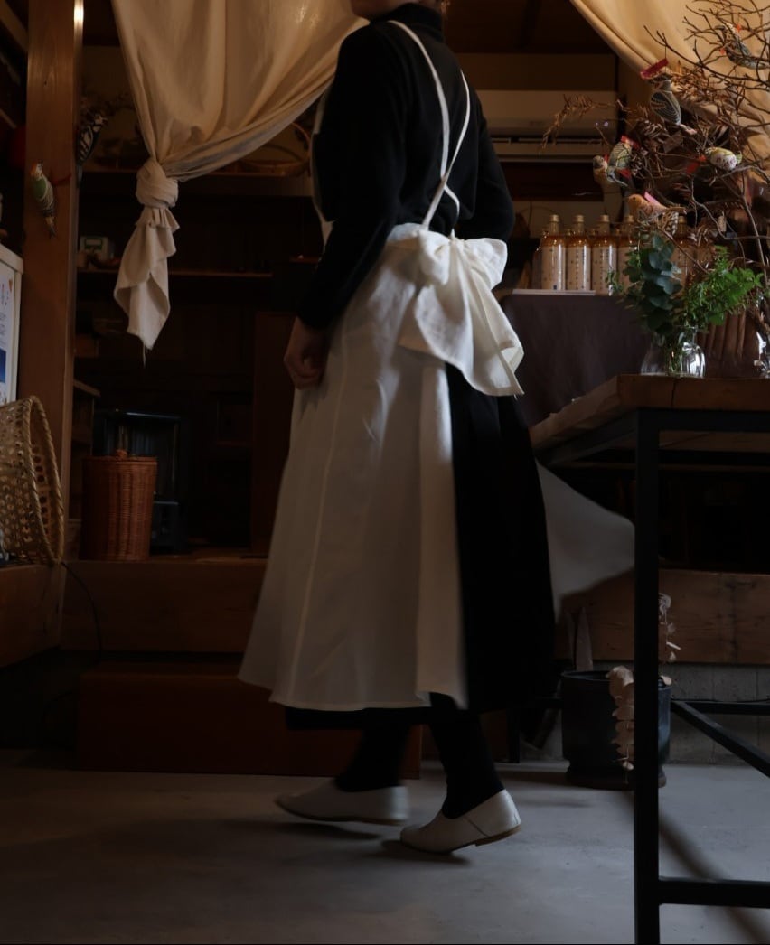 material ベルギーlinen 100 % 60番手 color オフホワイト/ブラック 腰下 80cm ウエストベルト 約70cm ポケット両サイドに2つあり 16.000+tax ×2 胸元のギャザーが目を引く エプロンです。 着こなしのポイントにしていただけるよう デザインを重視したエプロンになります。 ご自身の体型に合わせて 胸元のギャザーを、 広げたり縮めたりと お好みのバランスで ご着用頂けます。 しっかりと腰で支えて着用いただくため 首への負担も少なく 着用体感として 重さを感じにくく ご着用いただけるかと思います。 今回は通常のフレアスカートの裾に 15cmの大きなフリルを付け よりフェミニンな印象にしています。 お洗濯は、ネットに入れ洗濯機で洗っていただけます。 胸元のギャザーを伸ばして乾かして下さい。 出来れば(blackや濃い色は特に)陰干しをおすすめいたします。